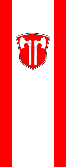 It is a red-white-red vertical triband with ratio of stripes approx. 1:4:1. The coat of arms is shifted to the top within the central stripe.