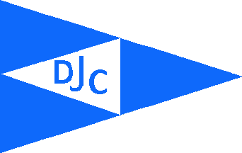 The pennant is blue, in a throughout white triangle pointing to hoist is a blue inscription "DJC".