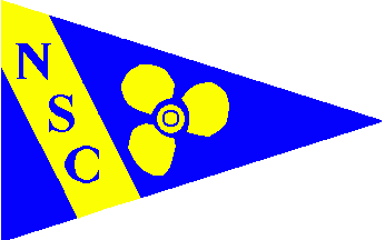 The blue pennant is divided by a yellow descending stripe containing the blue initials "NSC". The stripe is shifted to the hoist. On the flyend is a yellow ship's propeller.