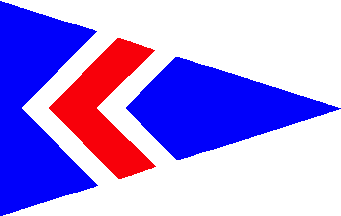It is a purple pennant with a black chevron, fimbriated white, shifted to and pointing towards the hoist. In the centre of the pennant are eight white arrowheads pointing towards a white dot between them. In this way they are forming some kind of double Maltese cross.