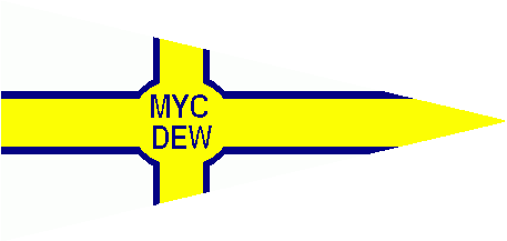 White pennant divided by an off-centred yellow cross fimbriated blue with a disc of the same in its centre with blue inscription "MYC" (1st line) "DEW" (2nd line). Source: yacht club website