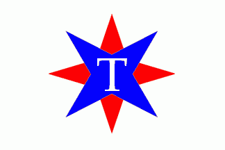 Carl Tiedemann Stauerei is a freight- and cargo company for transports by ship.The flag is white a red 4-point star pointing to the following directions clockwise 0gon, 100gon, 200gon and 300gon. The star is superimposed by a blue 4-point star pointing to the following directions clockwise 50gon, 150gon, 250gon, 350gon with a white capital "T" in its centre. The whole is surrounded by a big blue capital "C".