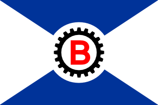 Company website (access point after Flash introduction): The flag is faintly visible in centre background. It is divided per saltire white (left and right triangles) and blue (upper and lower triangles); in the centre is placed a black cogwheel enclosing a red initial ‘H’. The blue triangles have a diminished surface as there are curved cut-outs surrounding the cogwheel, fimbriating it as it were.