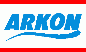 This Haren based company has a white flag with thin red stripes at the top and bottom edges. In the white field is a celestial blue inscription in italic capitals "ARKON". Below the inscription is a wave of the same colour.