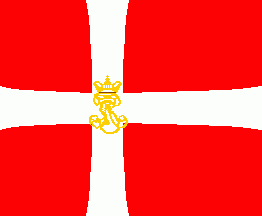 The flag has the design of a military colour, i.e. a red cloth parted by an off-centred white cross patty.