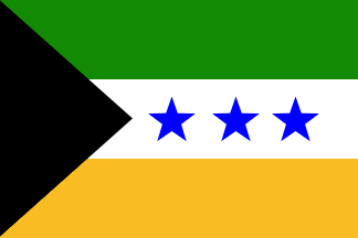 The flag of Viche is horizontally divided (1:2:1) green-white-golden yellow with a black triangle placed along the hoist and three blue stars placed horizontally in the white stripe.