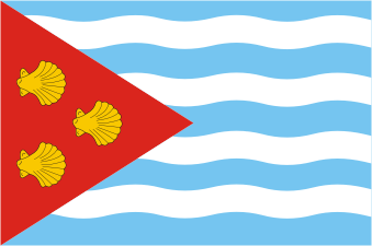 "The ratio of the flag is 2:3. With a wedge at the hoist (or. wedged at the hoist) it is turquoise blue, divided by four barry, wavy lines of silver (white) or pearl grey. Within the red wedge are three golden scallops.""Wedge" should perhaps be translated as triangle. The scallops are Venus shells (the term "venera" is normally used for that kind).