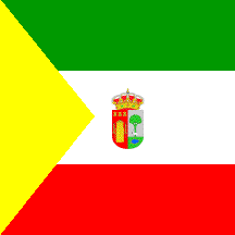 The flag of Busto de Bureba (municipal website) is horizontally divided green-white-red (3:4:3). Along the hoist is placed a yellow triangle covering 4/10 of the flag's length. In the middle is placed the municipal coat of arms.