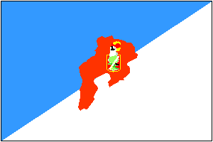 Flag divided diagonally from bottom hoist to top fly, the top hoist is light blue and the bottom fly white; on the centre, a red map-shape – of the municipality? – with a coat-of-arms on it.
