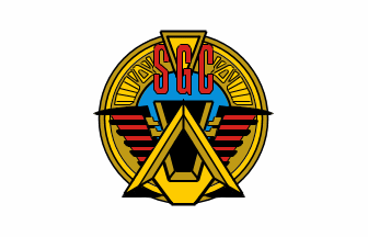 The flag of the Kelowna Hierarchy, a nation-state of the planet Langara, appears in a goverment bunker in an episode at the end of season 6. It is black, with a odd-looking irregular silver crescent — resembling the head of a wrench — in its center, and a downward-aimed golden dagger superimposed over it.