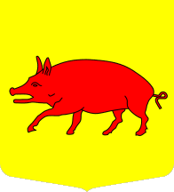 The arms of Svinarp can be blazoned as "Or, a pig passant Gules". They are used as shield-shaped table flags. The arms are canting, as "svin" is a Swedish word for "pig", while the tinctures are the same as in the arms (and flag) of Scania.