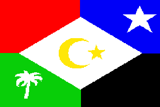 In one of the episodes the characters of the series visited an imaginary arabian country. In some scenes the nation's flag was visible. As you can see the flag is divided into four equal fields with a diamond shaped field in the middle. The top left field is red, the top right field is blue with a white star, the bottom left field is green with a white(or maybe yellow) palm tree, the bottom right field is black and the diamond shaped field is white with the islamic symbols, the moon and the star (as in for example the Turkish flag) in gold (I think it was gold colored but I'm not 100% sure).