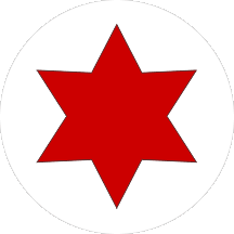 The flag of the Yellow Empire shows a dark red eight point star on white, with a (black-line contoured) also dark red disc inside it.