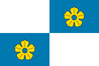 The flag of Bégard, as reported by Hervé Prat, is quartered white and blue with a yellow flower. The flag is a banner of the municipal arms, which are (GASO):
