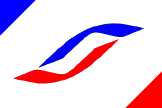 The house flag of SeaFrance is white with a blue isosceles triangle in the upper hoist and a red one in the lower fly. In the centre is the company's logo. The flag appears to be a "modernized" version of the house flag of the SNAT.