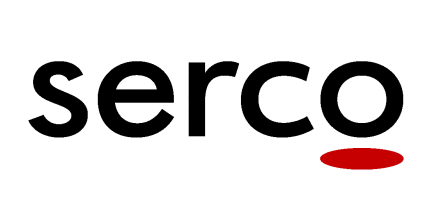 The Serco corporate flag can be seen in photographs online, specifically at http://www.reuters.com/article/us-britain-g4s-serco-idUSBREA4B0YZ20140512 (photograph directly at http://s1.reutersmedia.net/resources/r/?m=02&d=20140512&t=2&i=896328863&w=644&fh=&fw=&ll=&pl=&sq=&r=CBREA4B1SUX00). The flag consists of the corporate logo centered on a white field. The logo features the word "serco" in black lowercase letters stretched across the center of the flag, with a small red oval beneath the "o" that ends the word..