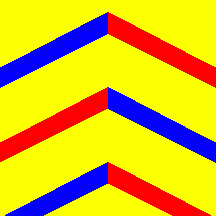 Shield Or, three chevronels parted per pale, the first and third Azure and Gules, the second Gules and Azure.
