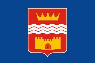The flag is blue with an escutcheon in the middle - red with three white waves in the middle, a yellow crown in chief and a yellow castle in base.