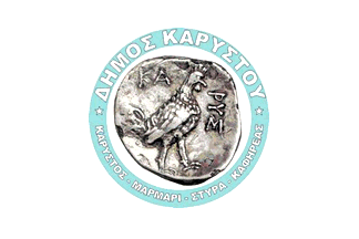 The flag of Karystos (photo, photo) is white with the municipal seal. In the center is a silver stater of Karystos, ~313-265 BC. Around is a light blue circle with the name of the municipality and of the municipal units.