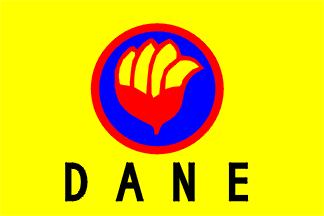 According to Brown's Flags and Funnels of Shipping Companies of the World (1995) [lgr95], the house flag of DANE Line was yellow with a blue disk bordered red charged with a red flower with four yellow petals (?). DANE is written in black below the emblem.
