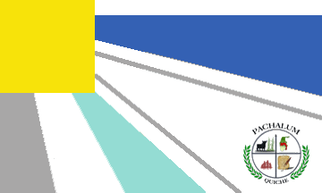 An unusual design comprising blue, light blue, grey and white rays of irregular widths emanating from the upper hoist, a yellow square at the upper hoist, and the arms in the lower fly.