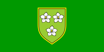 The coat of arms is "Vert three potato flowers argent seeded or", with a lighter shade of green than the flag background.