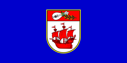 The flag (photo) is in proportions 1:2, blue with the coat of arms, bordered yellow, in the middle.