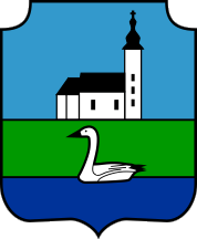 The coat of arms of the Municipality of Martinska Ves is in a shield shape that has in its top right and left corner a volute, and the bottom part ending in a point. The shield is divided by a golden line in three differently coloured areas. The top field has on a light blue background the drawing of the parish church of St. Martin in Martinska Ves. The bottom filed is divided into two unequal parts, the top two thirds are green with a figure of a goose turned to the left, and the bottom third is dark blue.