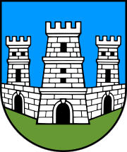 The coat of arms is of oval shape, azure on a base vert the city walls without embattlements with three open doors, above the central an oval embattled tower with three (1-1-1) windows and a parapet and to its left and right each a shorter oval embattled tower with three (2-1) windows. The shield is set in an oval baroque cartouche. It is also noted that this coat of arms is stone-carved, set in the town hall.