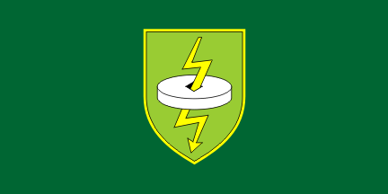 The table flag (photo, photo) is a rectangular, simplified version of the ceremonial flag, vertical, green with the coat of arms, inscriptions and branches.