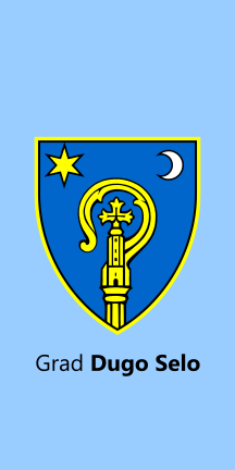 Dugo Selo displays a vertical flag, somewhat lighter blue than usual, with a sligtly larger coat of arms, and with the inscription of the town's name under it.