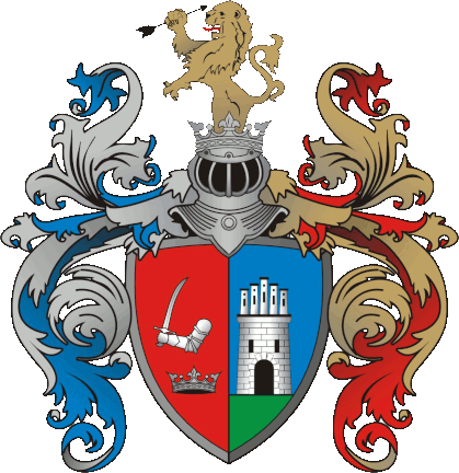 Hungarian saber can be seen. In the blue field on the left side of the shield, you can see a silver bastion standing on a green shield base with an arched gate,
