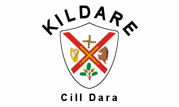 A white flag with a centred shield, bearing a St. Patrick's cross and four emblems in each quarter. The name KILDARE is arched above, and Cill Dara below.