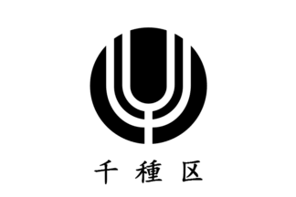 The white flag has a black ward symbol mark in the center with the kanji name in black horizontally at the bottom. The symbol mark is a stylized kanji 千 Chi of Chikusa in a form of a growing tree. It represents the ward blessed with the sun and green trees.