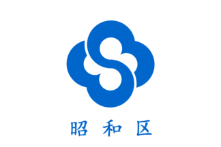 The white flag has a blue ward symbol mark in the center and the kanji name in blue horizontally at the bottom. The symbol mark is a stylized S of Showa in a form of a lucky 4-leaf clover. It represents the ward exponential development.