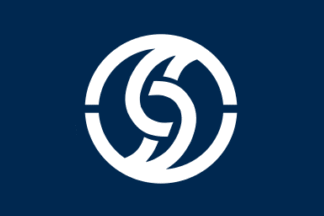 The city emblem was adopted on Jul 19th 1940 but there is no flag law. The blue flag has a white city emblem in the center. The city emblem is a stylized kanji 下 Kuda in a form of a pine needle. The circle symbolizes a conformity and the pine needle does calm waves of Kasado Bay.