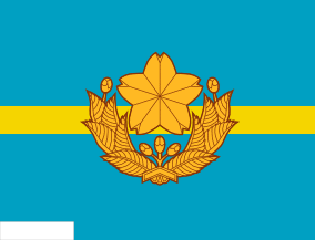 A large dark yellow cherry blossom in the center with one gold horizontal line in aqua field. Adopted on March 25th 2010.