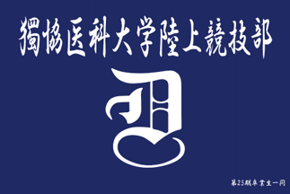 Track and field club; The club flag has dark blue background with a white university emblem and horizontally written kanji university and club name in white.