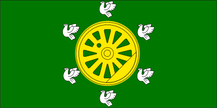 surrounded by 6 silver stock pigeons. Flag proportions 10:11,