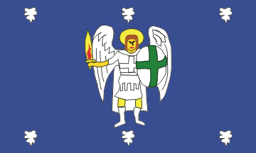 Blazon: Azure St. Michael (?) clad Argent nimbed Or holding dexter a flaming sword of the same and sinister an oval escutcheon Argent a cross Vert in chief and base six clouds Argent.