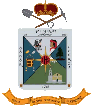 The shield is chopped and sliced, forming 4 sections which comprend the following blazons from top to bottom and left to right: the effigy of a Spaniard forward to that of a Tarahumara, representing the races as bases of mestizaje, a jug or esquipe, tool for extracting metal of the Mines [with a bar of silver and gold, two coins of each also shown], it was used in past times, a pine tree represents the forestal wealth of the municipality. The highest hill of the State (above 3000 Mts) or the Mohinora occupies the fourth section, Mohinora is a Tarahumara word and signifies “Head between clouds”. The Temple of Guadalupe representing the Catholic faith, the year of 1745 makes allusion to the discovery of the Mine of San Juan Nepomuceno, the shield carries as a complement a ribbon with the name of the founding Mine: Juan Nepomuceno; this shield is crested by a crown, a pick and shovel the first, because these lands pertain to the Kingdom of Spain, the second ones to reaffirm the mining vocation of the municipality.
