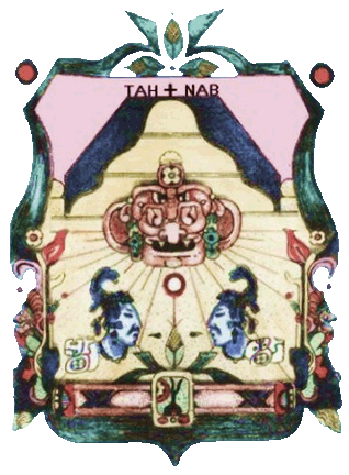 In the center of the majestic mask of Kinich-Ahau found in Kankí, which with its archaeological astronomic phenomenon singular in its form, marked always for Tenabo as an origin of our ethnicity. From this archaeological relic descending into rays of gold the light of sun which marks the nascence of planting and later the harvest, at the same time signifying the fertilized furrow of corn in the pre-Hispanic era. Behind Kinich-Ahau, one can observe the colonial symbolism with the upper part of the church of Tenabo, religious union of this town and fruit of mestizaje. Crowning the colonial church is the classic corbel Maya arch.