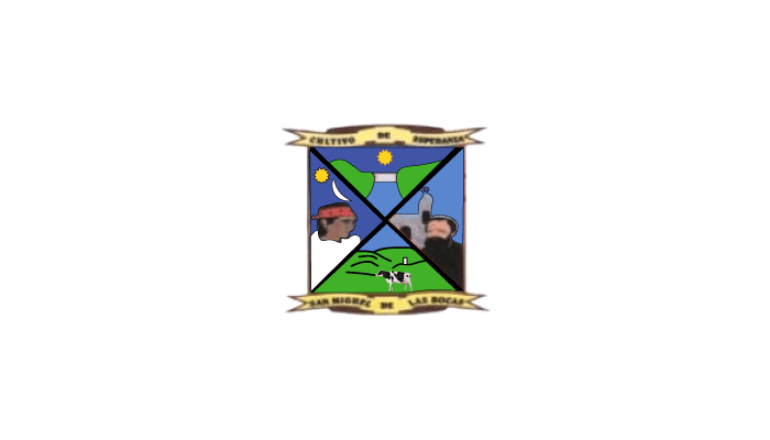 The history of the coat of arms is unknown, according to the council. The shield is divided diagonally into four sections. The upper one depicts the San Gabriel dam with the sun overlooking it. To the left, an Indian man under the night sky is seen; to the right, a Jesusit missionary, both signifying the indigenous and Spanish periods. At the bottom, a tree for the environment and a head of cattle for the cattle-raising industry, with the year 1607 marking its foundation. At the bottom of the shield is a ribbon reading "SAN MIGUEL DE LAS BOCAS", the original settlemnet; at the top, a ribbon reading "CULTIVO DE ESPERANZA" [Cultivation of Hope].