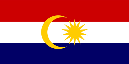 Red-white-blue horizontal tricolor with crescent and sun in center. I have used RGB 255-204-0 in portraying the sun on Labuan's flag and will do so for all Malay state flags in this project that contain the color "gold" or golden yellow. I actually stand on solid ground in doing this, as it's apparent that Malay flag manufacturers are beginning to see the wisdom in printing with the darker shade of golden yellow. The latest versions of Perlis, Penang, Perek, Sarawak, and Selangor in particular are being made up with golden yellow whether they're sewn or printed. Until recently, the colors of yellow would vary greatly with a sort of light lemon yellow being prominent along with 255-204- 0. In some cases, it was almost impossible to see the yellow on the flags of Labuan, Penang and Perek because the white in each of those flags completely absorbed the yellow.