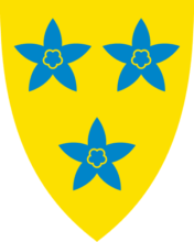 Blazon: På gull grunn tre blå fembladingar, 2-1. In English: Or three