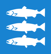 The description provided: "... tre sølv laks på blå bunn." In English: Azure three salmons argent.