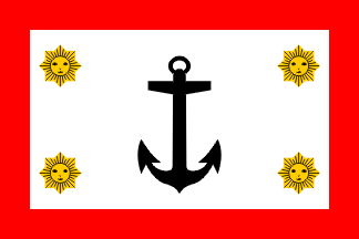 2:3 white flag with red border abd black anchor in the middle with a sun