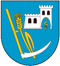 Arms: on a blue shield a scythe, a wheat stalk and a crenelated castle.