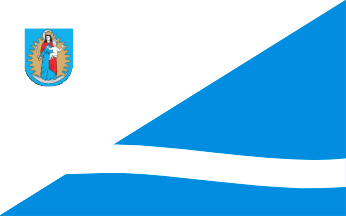 Flag: rectangular piece of cloth in the dimensions of 750 mm by 1200 mm in the colors of white and blue placed in the slant. Upper left part of the flag is white; lower right part - blue, slightly darker than the background of the Arms. On the white field the Arms of the town are placed. On the blue field - a white, wavy ribbon.