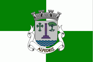 Shield Argent with base wavy of Azure and Argent, a pillory Purpure flanked by a Latin cross fleury Vert at dexter and a pine tree Vert at sinister. Mural crown Argent with four visible towers (town rank) and white scroll with inscription in black initials "ALPEDRIZ"
